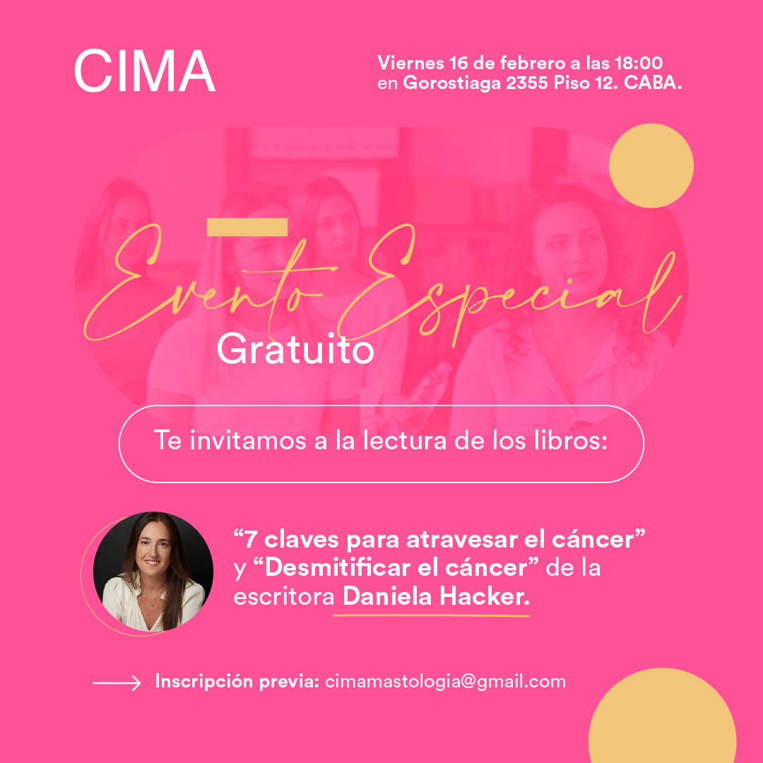 En su constante compromiso con la salud, el Centro Integral de Mastología (CIMA), invita a la presentación de los títulos Desmitificar el Cáncer y 7 claves para atravesar el Cáncer, de la autora Daniela Hacker. Será un evento abierto y gratuito en su sede ubicada en Gorostiaga 2355 piso 12, CABA. Se realizará el viernes 16 de febrero a las 18hs.