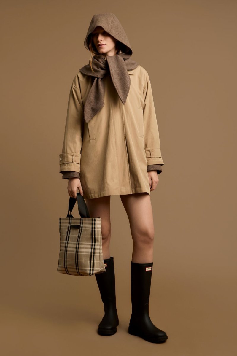 Los accesorios en escocés aportan un guiño clásico renovado, mientras que la marroquinería, sobria y funcional, incorpora tratamiento repelente, reafirmando uno de los pilares históricos de la firma.